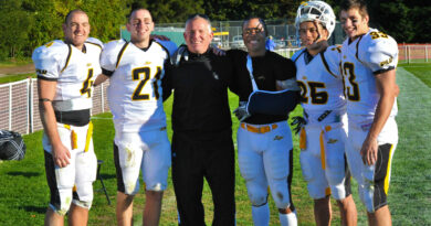 Left-Making the best of it in the Corvallis downpour – winning helps; Right-Warming up in the bar post-game.