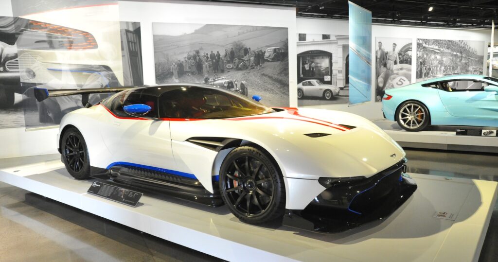 Moving on to the 21st century is a beautiful example of the 2011 One-77. As the name implies, only seventy-seven were made at a base price of $1.2 million. With customization, every car was sold for far more than that. It boasted a carbon fiber tub and an outrageous, Cosworth developed 750 HP 7.3 Liter V12 engine, derived from the production 5.9 Liter V12. Probably one of my top three AM designs for beauty and performance. With a legitimate top speed of 220 MPH, this car was a great leap in technology for production Astons.
