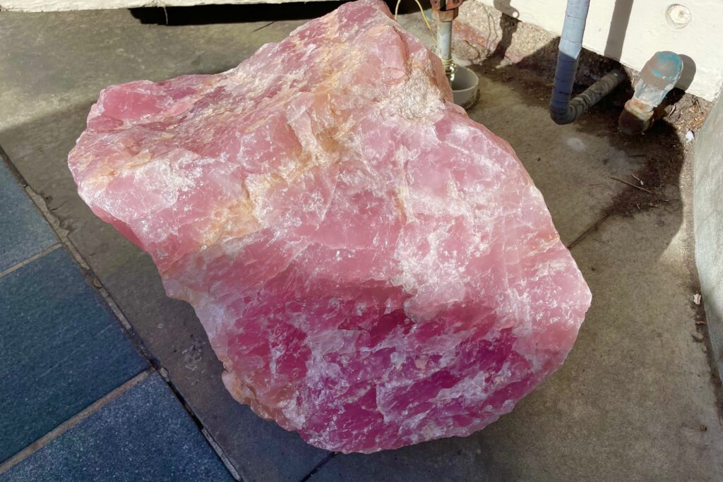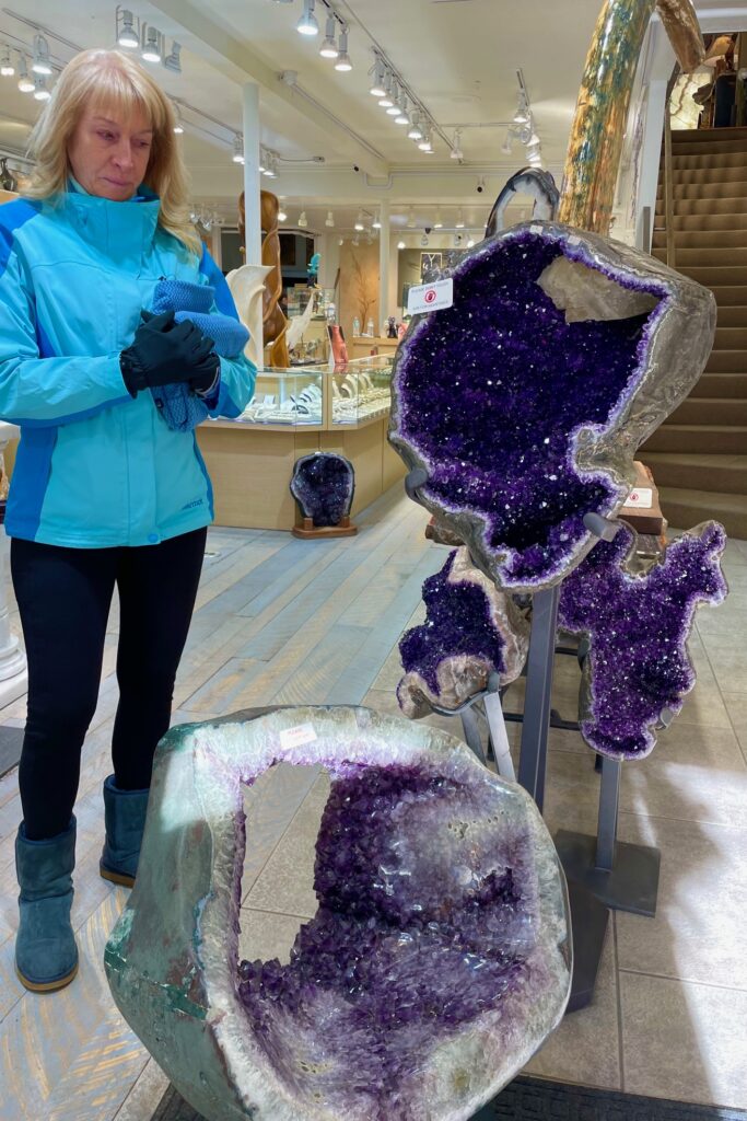 Left – a huge pink quartz outside the Tresor Park City jewelry store; Right – a couple cut crystal stones inside Tresor’s.