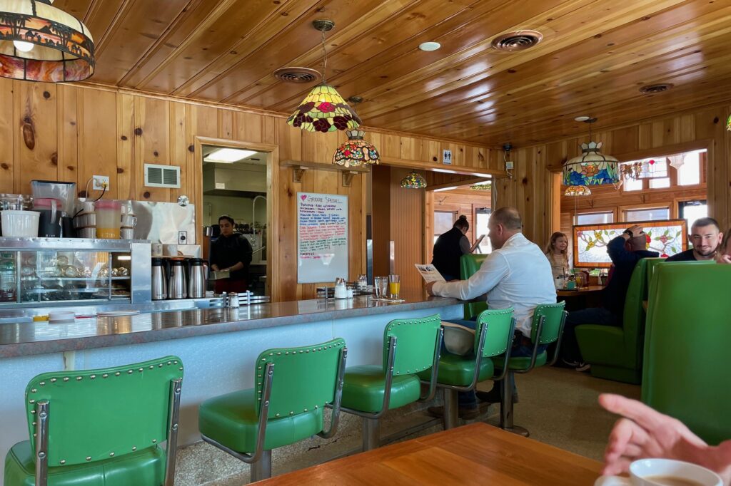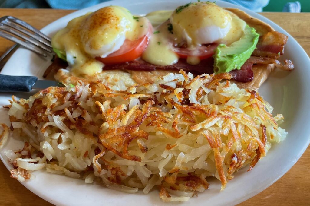 Left – The all knotty pine paneled interior of The Griddle; Right – California Eggs Benedict.