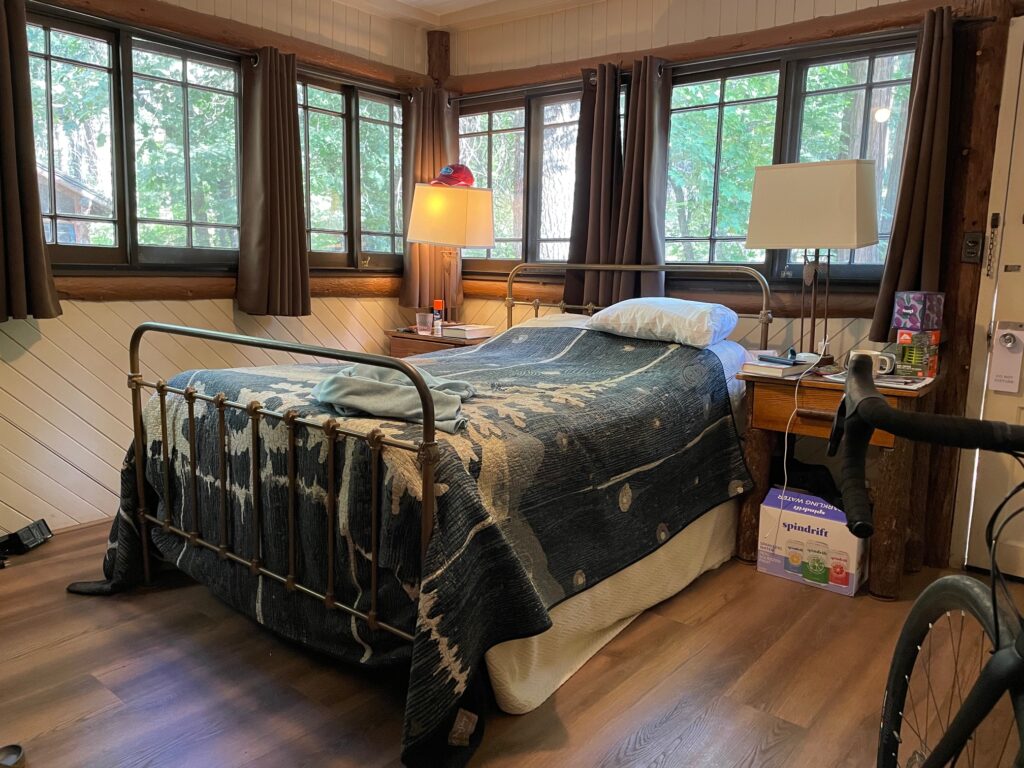 A late day entrance to the park avoids much of the backup and we wind our way unmolested to Curry Village where our one room log cabin, complete with sink and shower, awaits. John and Jill have arranged a series of five cabins for family and friends. We are first to arrive. An old-fashioned brass key unlocks our door, revealing whitewashed wainscotting walls and ceiling, wood floors, white tiled shower and bathroom, and a tiny metal-framed double bed. Waist-high, single hung windows frame two adjoining walls.